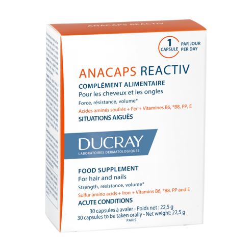 • Хранителната добавка ANACAPS REACTIV/АНАКАПС РЕАКТИВ помага за поддържане на косата здрава, в случай на реактивен и преходен косопад, причинен от стрес, умора, след раждане, смяна на сезоните, небалансирана диета