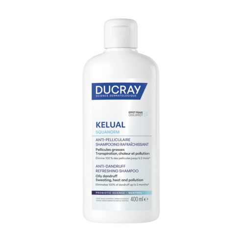 KELUAL SQUANORM Освежаващ шампоан с охлаждащ ефект против мазен пърхот, специално разработен за премахване на мазния пърхот, вследствие на пот, топлина и замърсяване. Истинска иновация, той представлява първото поколение високоефективни шампоани против пърхот, вдъхновени от благотворното и дълготрайно действие на пробиотиците, като осигурява незабавно усещане за охлаждане с -4°C, продължаващо до 4 часа*. Благодарение на технологията PROBIOTIC-SCIENCE той нежно премахва 100 % от видимия пърхот и остатъчните замърсявания още при първата употреба*, като същевременно предотвратява повторната им поява с ефикасност в продължение на 2 месеца**. Възстановете здравия, свеж и пречистен скалп само с едно нанасяне*. Много повече от обикновен шампоан против пърхот, той вече е спечелил 85% от потребителите* с освежаващата си формула, която поддържа естествения баланс на скалпа и космените влакна. Скалпът е незабавно освежен.
