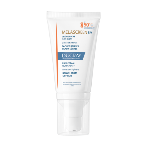 • MELASCREEN UV БОГАТ КРЕМ SPF50+/UVA МНОГО ВИСОКА ЗАЩИТА е първият фотозащитен продукт от Дерматологични лаборатории Ducray, който ограничава и изсветлява кафявите петна¹, причинени от излагане на слънчева светлина