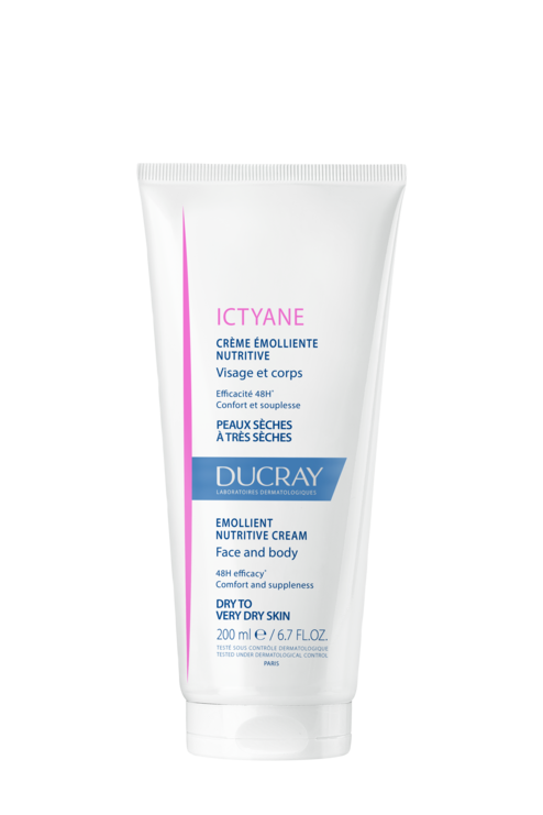 • La crème émolliente nutritive ICTYANE est le premier soin pour la peau créé par les Laboratoires Dermatologiques Ducray, il y a plus de 30 ans • Un soin emblématique qui se transmet de génération en génération pour prendre soin au quotidien des peaux sèches à très sèches • Sa texture veloutée qui fond sur la peau et son agréable parfum aux notes délicatement fleuries, procurent instantanément une sensation de cocooning • Intensément hydratée et nourrie, la peau retrouve toute sa souplesse et son confort grâce à un duo d'actifs qui associe l'ACÉFYLLINE à l'HUILE ABYSSINIE • La crème émolliente nutritive ICTYANE dépose un film protecteur à la surface de la peau pour la protéger du dessèchement et lui procurer du confort pendant 48 heures